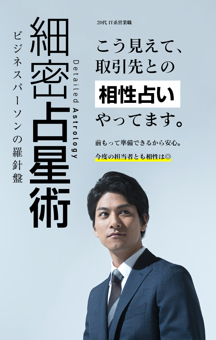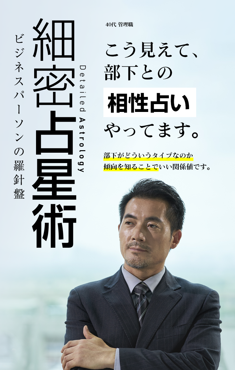 一般的に二者間の親和性・相性というと恋愛を想像されますが、相性は男女に限ったことではありません 人との関わりは親子、友人、仕事関係など恋人意外にも様々あります たとえ血が繋がった親子でも合う合わないがあるように、本質的な相性と日々環境の変化に合わせて変わってくる相性の2つがあります 本質的な相性を見極めた上に、日々変化するお互いのバイオリズムをチェックすることで、最適な対応や事前の心構えができるようになります ビジネスにおいて一番大切なのは人間関係です。ぜひ細密占星術の相性占いをビジネスツールとして活用してみましょう。