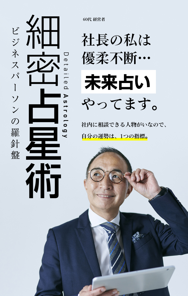細密占星術では、「⽣まれた時」「今」「未来」の3つの時間と、⾃分と相⼿もしくは会社(組織)の関係性を組み合わせて、あなたの”運命”を読みときます。 他⼈からの助⾔より、⾃分できちんと調べて、納得した上で⾏動に移したい。 そういった⽅に最適です。 是⾮、⼈⽣の指標となる「細密占星術」を試してみませんか?